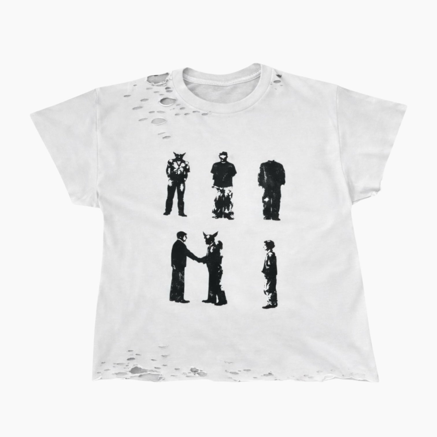 Hand distressed, slightly cropped fit mid-weight white t shirt with screen printed imagery. Very solid statement piece.
